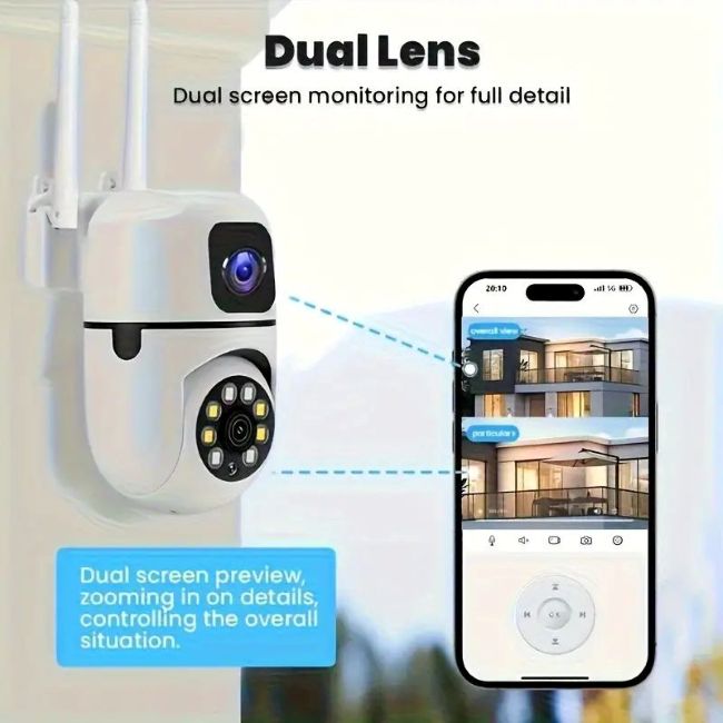 Cámara Inteligente de Doble Visión, Wi-Fi 2.4G, Seguimiento Automático, Alarma y Visión Nocturna de Color, Deteción de Movimiento con Luces de Inundación, Rotación de 355° y Inclinación de 90°, Audio Bidireccional, Deteción de Humanos, Notificación de Movimiento, Grabación de 24 Horas, Monitoreo de Mascotas